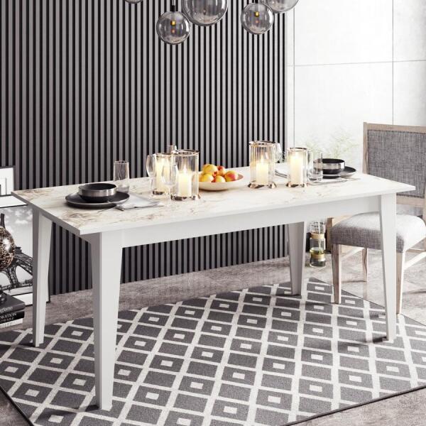 Változtassa át étkezőterét a modern és sokoldalú, többfunkciós étkezőasztallal Emelje fel étkezési élményét lenyűgöző és funkcionális étkezőasztalunkkal. A 100% melaminbevonatú forgácslapból készült asztal nemcsak tartós, hanem elegáns és modern esztétikát is sugároz. Verje ki kreativitását a többfunkciós kialakítással Ezt a többcélú étkezőasztalt úgy tervezték, hogy alkalmazkodjon az Ön folyamatosan változó igényeihez. Akár vacsorapartit rendez, akár otthonról dolgozik, vagy egyszerűen csak családi étkezést tart, ez az asztal könnyedén átalakítható, hogy megfeleljen az Ön igényeinek. Tágas méretei: 180 cm szélesség, 76 cm. 8 cm-es magassága és 90 cm-es mélysége bőséges helyet biztosít az összes étkezési kelléknek. Tapasztalja meg a márvány időtlen eleganciáját Ez a márványmintával megbabonázó étkezőasztal minden helyiséget kifinomulttá varázsol. Felhívjuk figyelmét, hogy a márványminta jellegéből adódóan a termékfotókhoz képest a színtónusban enyhe eltérések lehetnek. Fogadja el az egyediséget és a bájt, amelyet ezek az eltérések jelentenek, így minden asztal valóban egyedi lesz. Technikai részletek: