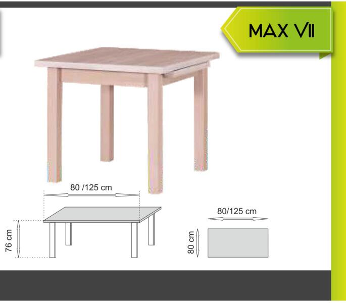 Szobák > Konyhabútor, étkezőbútor > Étkezőasztal - MAX VII étkezőasztal   Max VII elegáns asztal, mely tökéletesen illik a konyhába, étkezőbe vagy a nappaliba. Rendkívül praktikus, a legjobb minőségű anyagokból készült. Nagy színválasztékban áll rendelkezésre. (dió, fehér, sonoma )  Asztal szerkezete:  az asztal (asztallap kivételével) bükkfából készült,