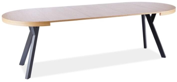 Étkezőasztal DOMINGO | tölgy A DOMINGO modern kihúzható étkezőasztal nagyon ízléses és praktikus, így étkezőjének vagy konyhájának meghatározó darabja lesz. A dizájn érdekes az ovális formájának köszönhetően, míg az asztal fém lábai modern kivitelben eleganciát adnak. Az asztal színes dizájnja, a natúr tölgy asztallap és a fekete lábak remek kombinációja egy modern otthonnak. A két 3x további 50 cm széles betétnek köszönhetően az asztal különböző hosszúságúra bővíthető akár 250 cm-ig. természetes furnér fém Az asztal kiváló minőségű MDF lapból készült, amely ellenáll a sérüléseknek. Az asztal fém lábai nem csak modern megjelenést, hanem stabilitást és szilárdságot is kölcsönöznek neki. Az anyag karbantartása is egyszerű . szélessége: 100 cm magasság: 76 cm hossza: 100-250 cm súlya: 72 kg max. terhelhetőség : 35 kg asztallap vastagsága: 4,8 cm betétvastagság: 1,8 cm láb: 6 x 3 cm szín: tölgy/fekete csomagok száma: 2