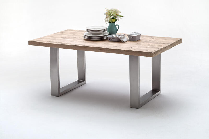 Étkezőasztal, lakkozott, tömör, csomós, fehérített tölgy, az asztallap teljes vastagsága: 5 cm, 180 x 100 x 76 cm, nemesacél váz